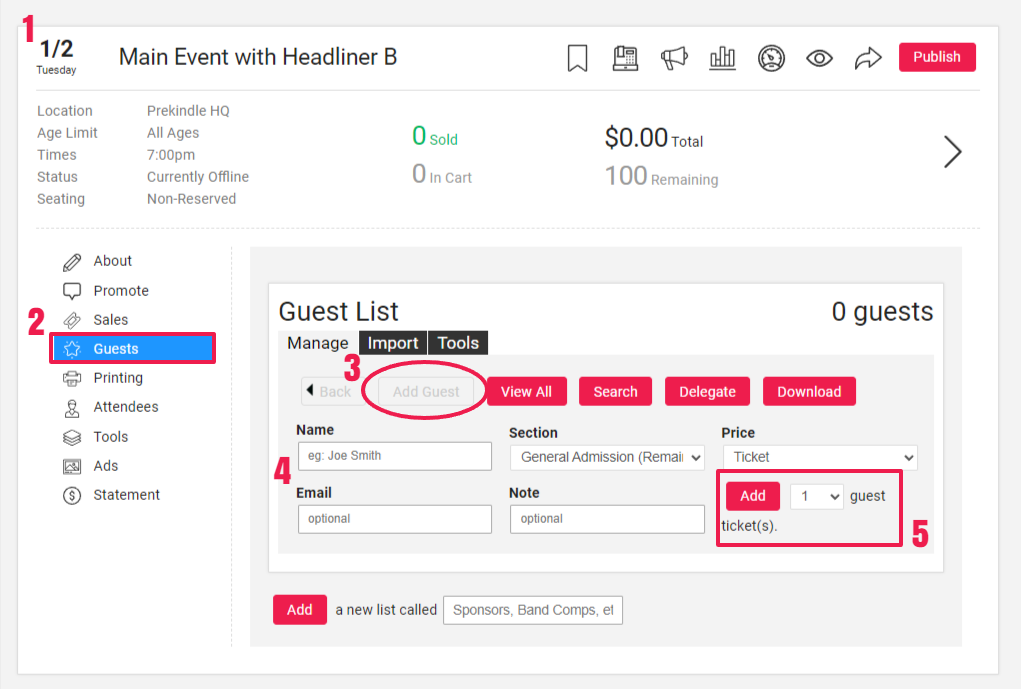 - The guest's name and ticket section/price are required. Adding an email address and note (not visible to the customer) is optional