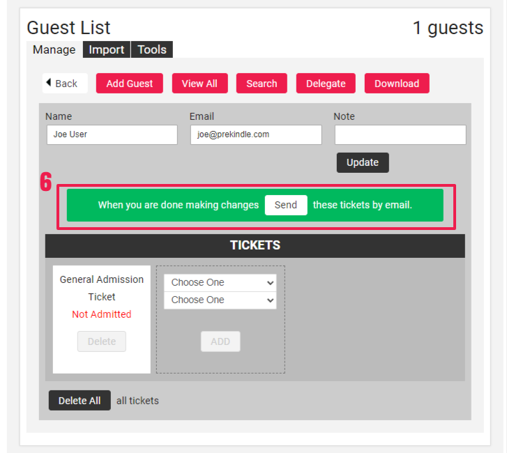 - To send the guest their tickets via email, click SEND