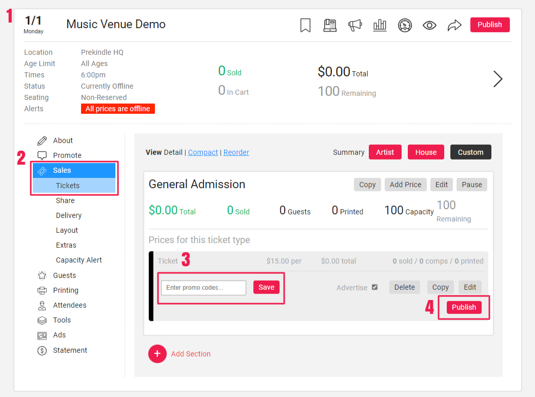 Find the ticket you'd like to add the promo code to. If you need to create a new ticket or a new price, click Add Section or Add Price.Enter the Promo Code