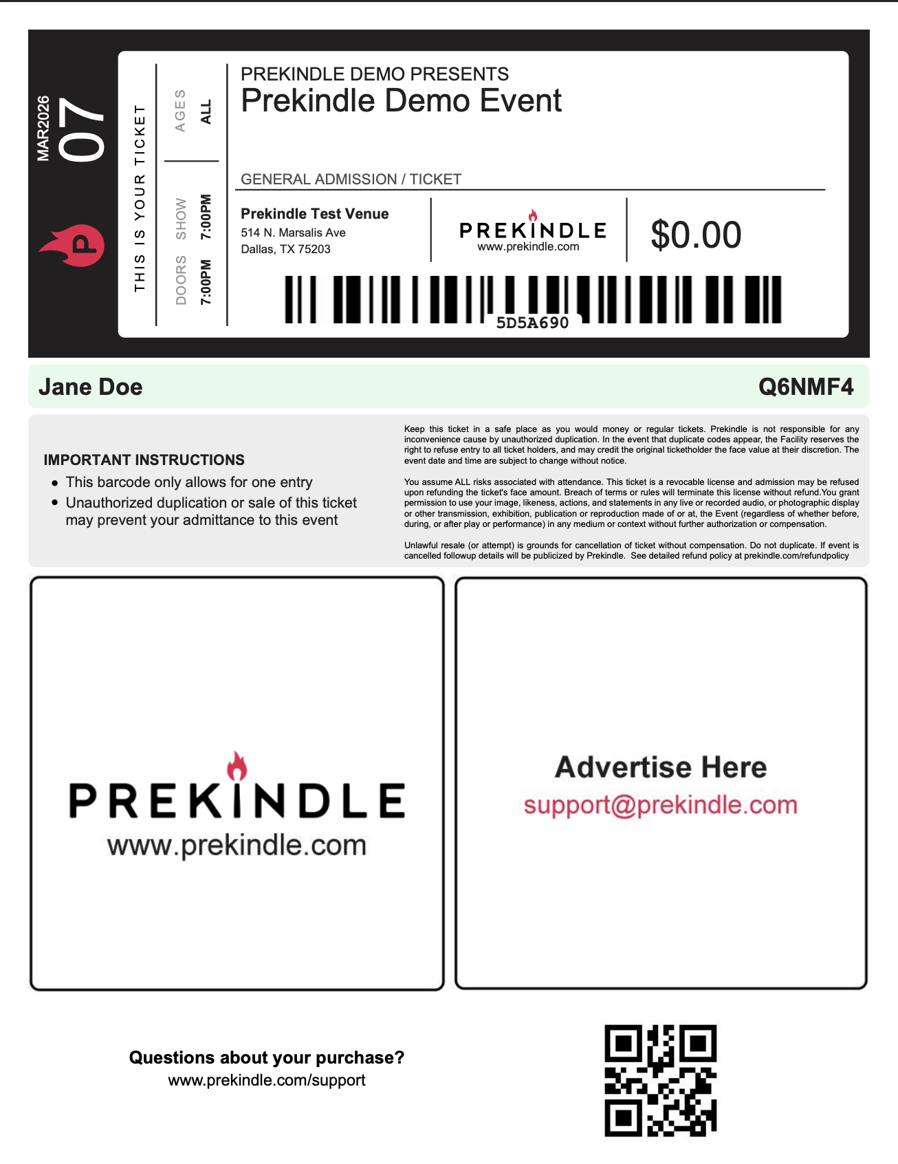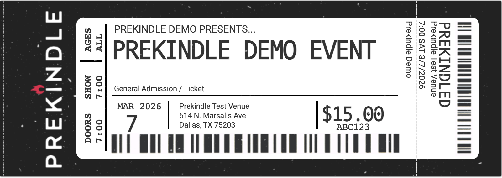 Prekindle prints these tickets on card-stock thermal paper. They include a tear-away stub you can keep if needed.