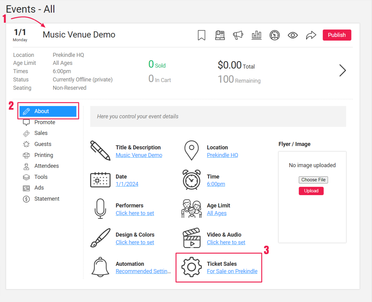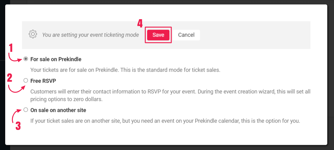 - Select For sale on Prekindle if you are planning on selling tickets through Prekindle. This is the standard mode for ticket sales
