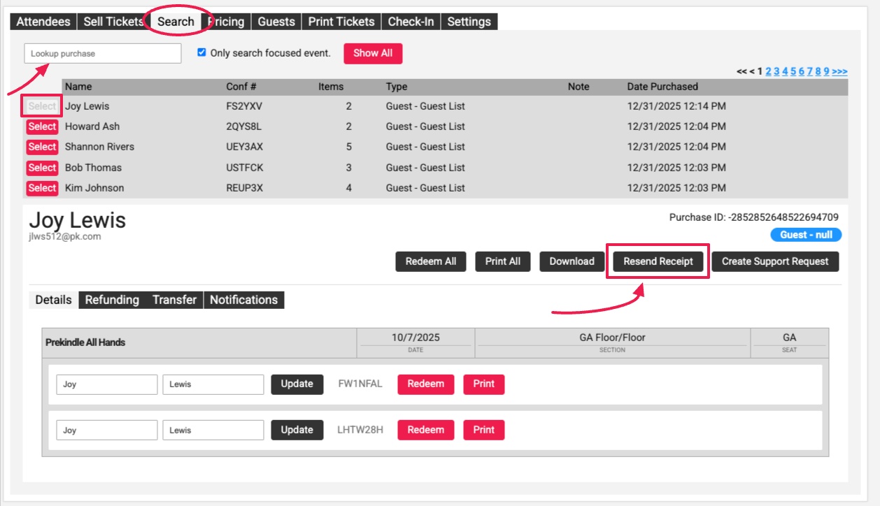 Click Select next to the correct search result to open the details.Resend the tickets and receipt