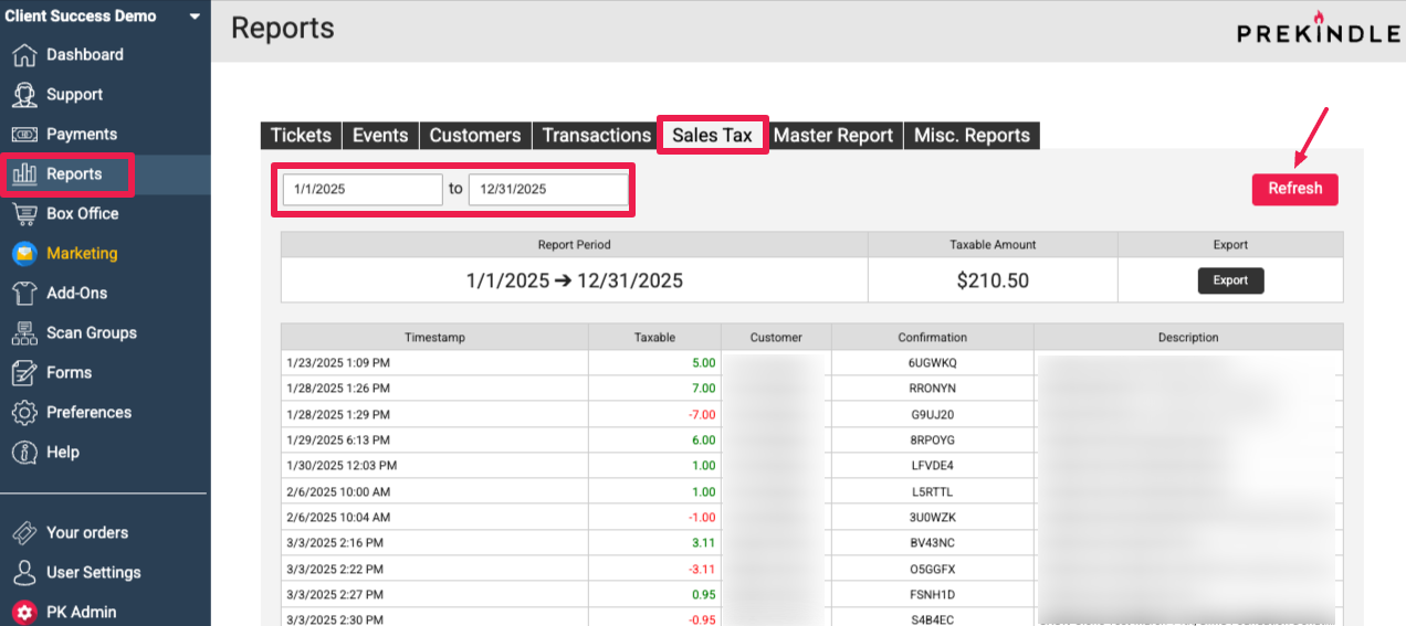 You can access your taxable transaction data directly in your Prekindle dashboard.