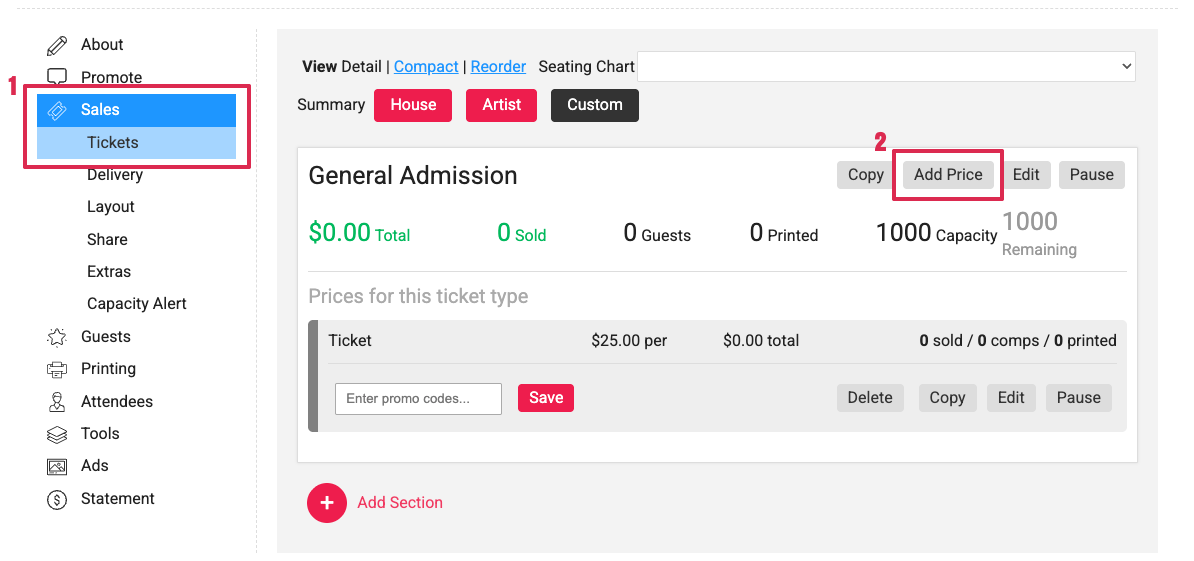 - On your event, find Sales; Tickets and find the Price Level or Ticket Type that you'd like to add the promotional offer to