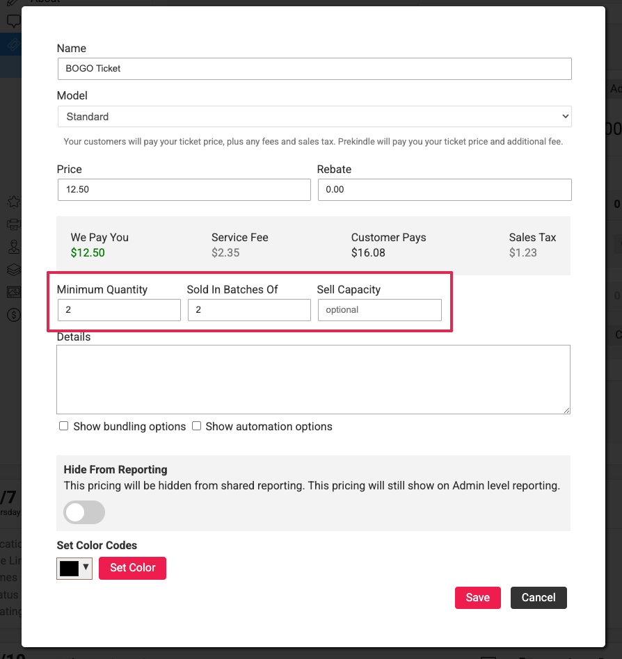 - Minimum Quantity to require the correct number of tickets per order (for example, 2 for BOGO or 4 for a 4-pack)