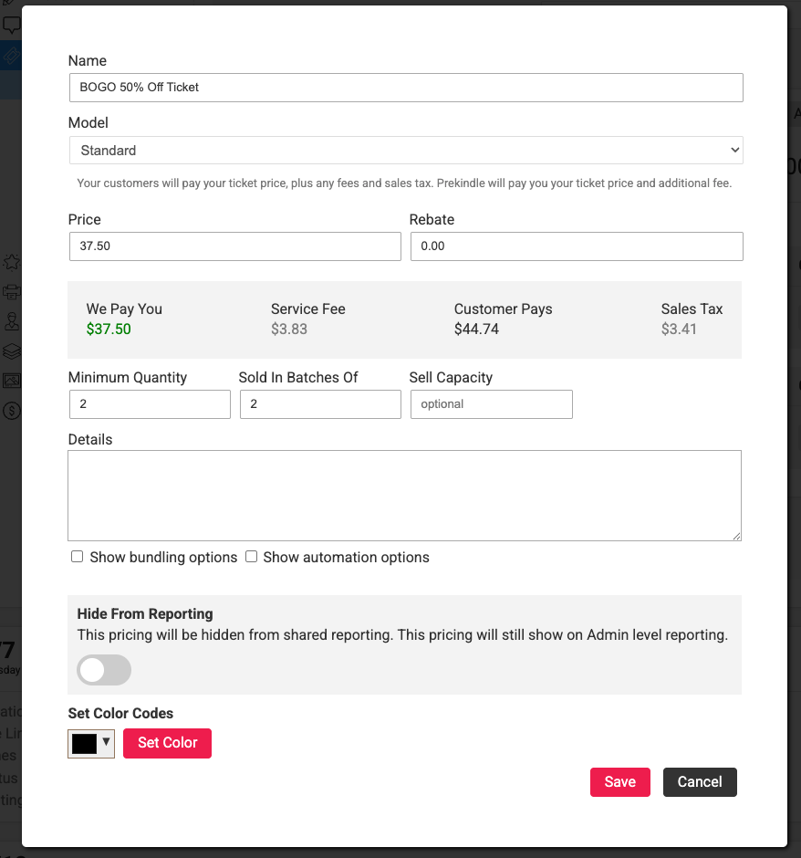 - Example: A standard ticket is $50. A Buy One Get One Free pricing means 2 tickets are $50